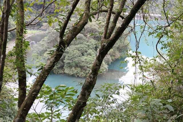 De Wulaï, la route étroite, d'abord goudronné, plus bétonnée, devient ensuite un chemin forestier qui suit une belle rivière aux eaux couleur turquoise, sans cesse renforcée par des torrents dont certains sont en fait des gigantesques chutes en cette saison pluvieuse.